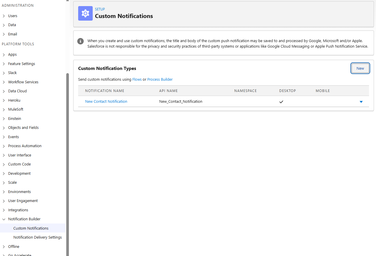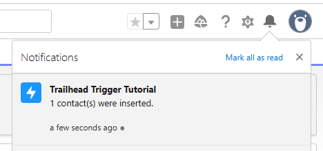 public with sharing class CustomContactNotification { // Public method public static void notifyUsers(Set<String> recipientsIds, Integer recordCount) { // Get the ID for the custom notification type created in Setup CustomNotificationType notificationType = [SELECT Id, DeveloperName FROM CustomNotificationType WHERE DeveloperName='New_Contact_Notification']; // Create a new custom notification Messaging.CustomNotification notification = new Messaging.CustomNotification(); // Set the contents for the notification notification.setTitle('Trailhead Trigger Tutorial'); notification.setBody(recordCount + ' contact(s) were inserted.'); // Set the notification type and target notification.setNotificationTypeId(notificationType.Id); // '000000000000000AAA' is a dummy targetId value notification.setTargetId('000000000000000AAA'); // Send the notification try { notification.send(recipientsIds); System.debug('Custom notification sent successfully.'); } catch (Exception e) { System.debug('Problem sending notification: ' + e.getMessage()); } } } - 트리거 작성