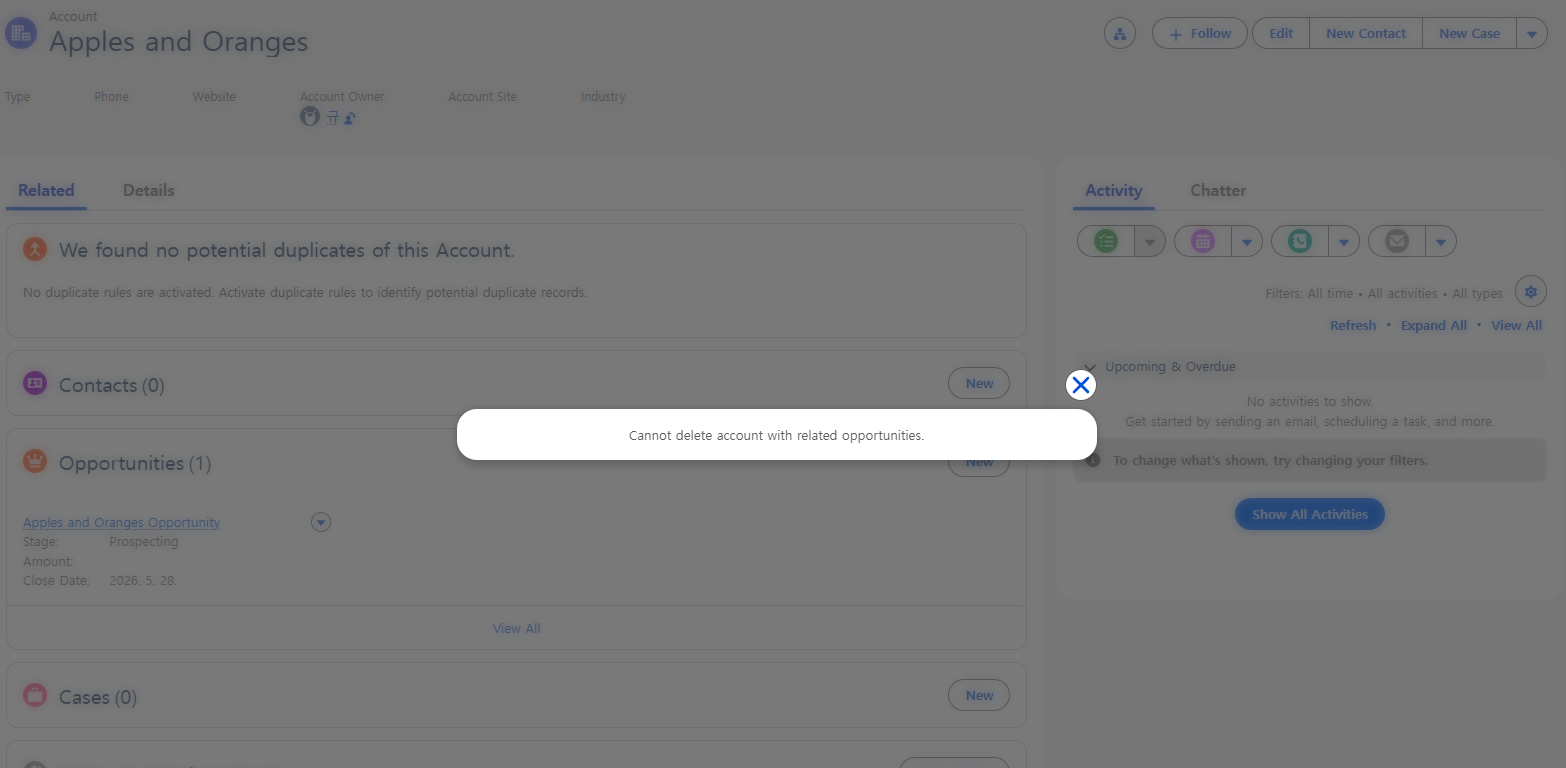 trigger AccountDeletion on Account (before delete) { // Prevent the deletion of accounts if they have related opportunities. for (Account a : [SELECT Id FROM Account WHERE Id IN (SELECT AccountId FROM Opportunity) AND Id IN :Trigger.old]) { Trigger.oldMap.get(a.Id).addError( 'Cannot delete account with related opportunities.'); } } - Salesforce user interface에서 Account 삭제