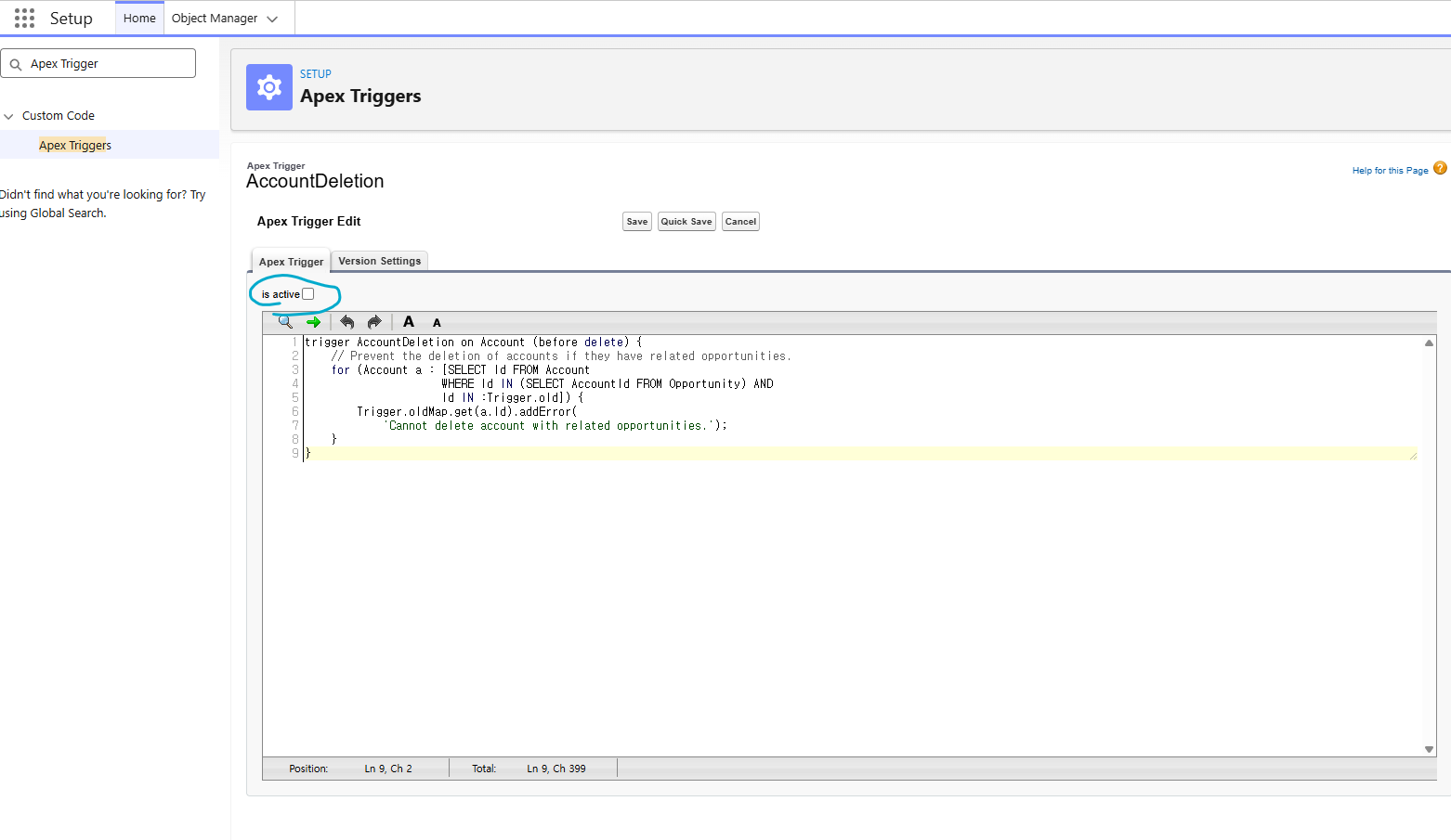 - trigger disable 하려면 Setup - Apex Triggers에서 is active 체크해제 필요